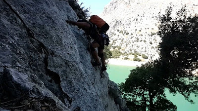 Tras una aproximacion rodeando en embalse, llegue a la pared. Me parecio una buena zona para empezar, prepare el equipo y comence con el primer largo. 50 metros para olvidar, con multiples travesias y cientos de rocas sueltas....... vamos un asco.